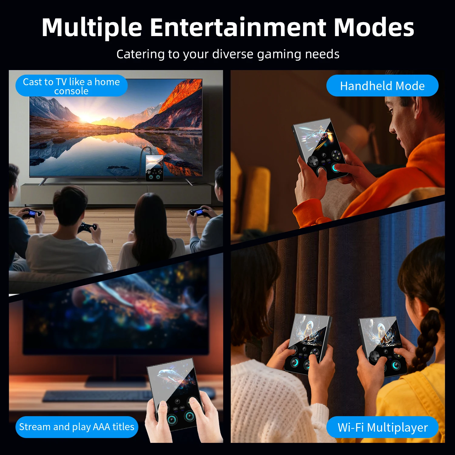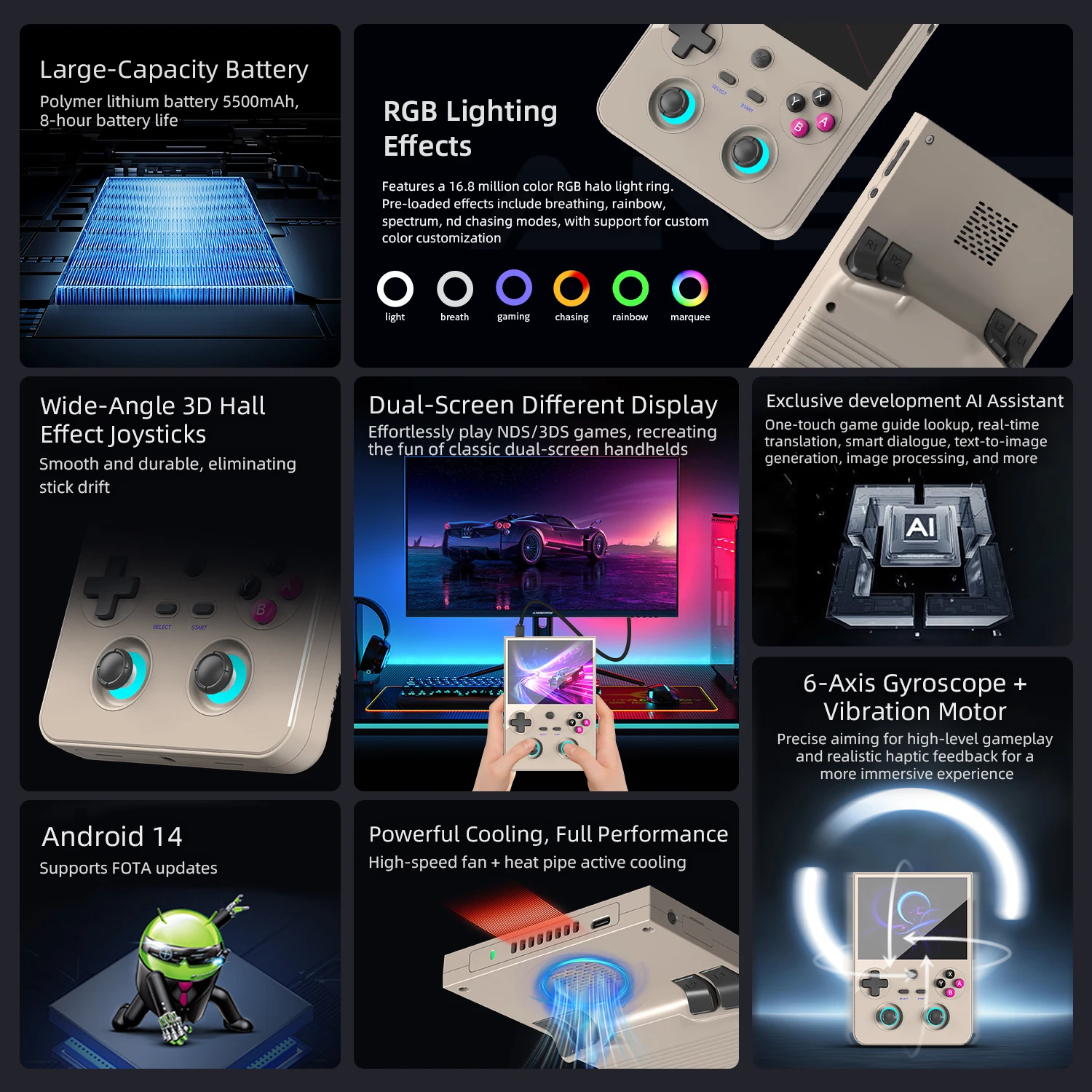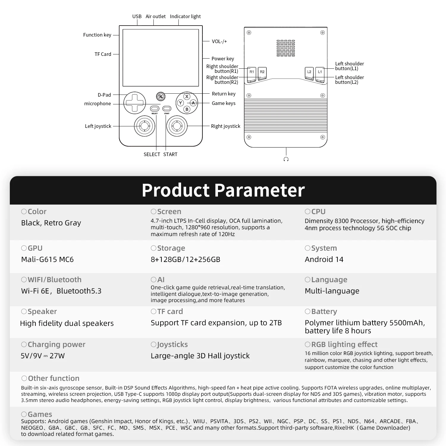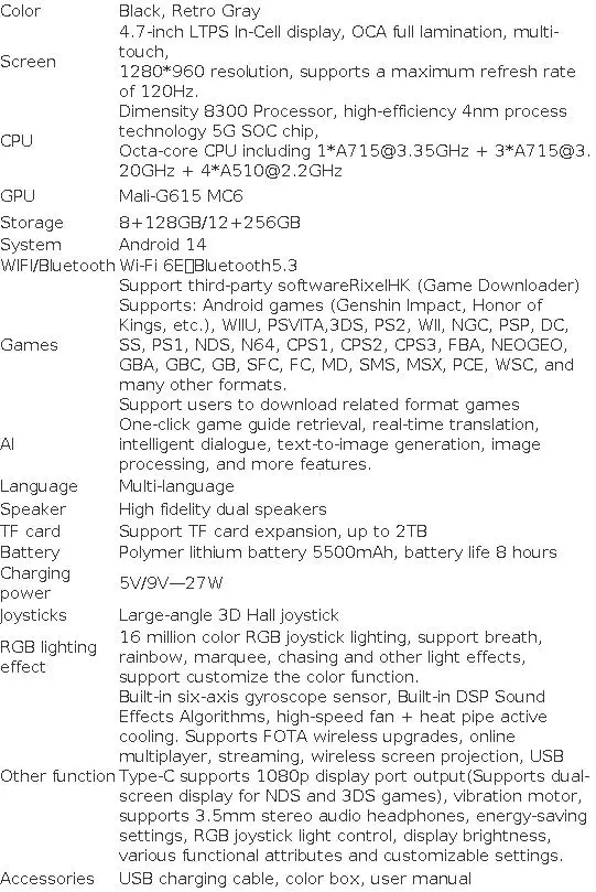 Built-in six-axis gyroscope sensor, Built-in DSP Sound Effects Algorithms, high-speed fan + heat pipe active cooling. Supports FOTA wireless upgrades, online multiplayer, streaming, wireless screen projection, USB Type-C supports 1080p display port output(Supports dual-screen display for NDS and 3DS games), vibration motor, supports 3.5mm stereo audio headphones, energy-saving settings, RGB joystick light control, display brightness,various functional attributes and customizable settings. |