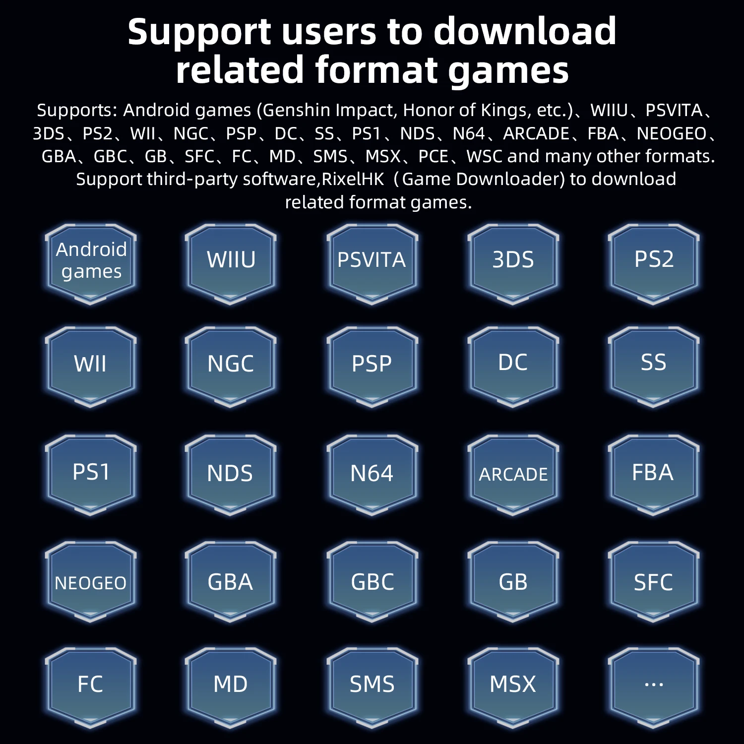 Supports: Android games (Genshin Impact, Honor of Kings, etc.), WIIU, PSVITA,3DS, PS2, WII, NGC, PSP, DC, SS, PS1, NDS, N64, CPS1, CPS2, CPS3, FBA, NEOGEO, GBA, GBC, GB, SFC, FC, MD, SMS, MSX, PCE, WSC, and many other formats. |