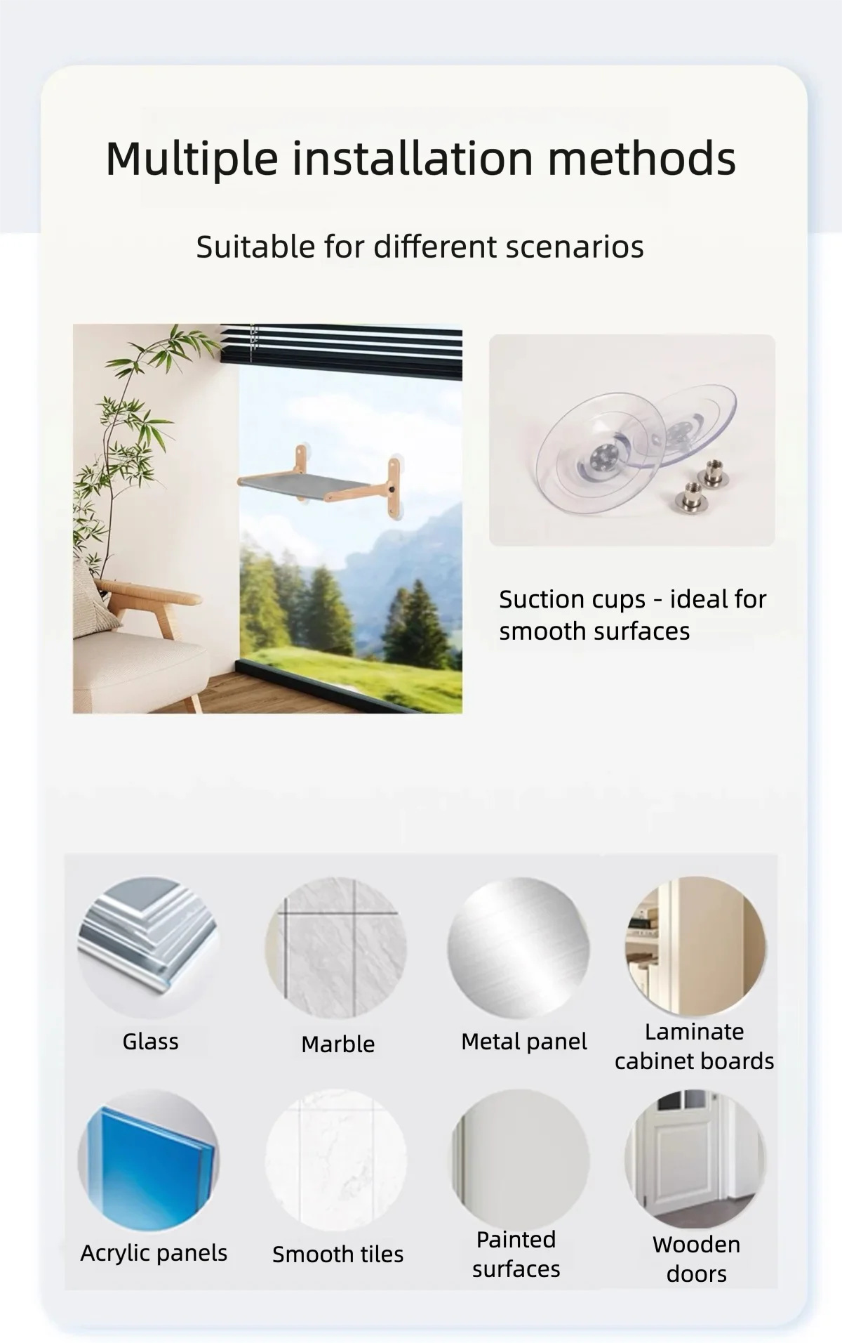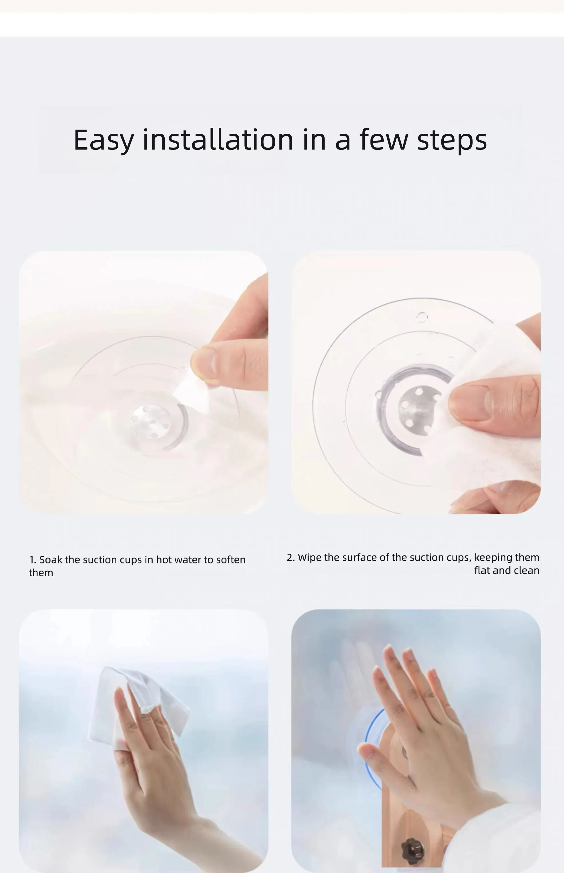 Easy installation → suction cups stick to glass, tiles, marble, metal, etc.