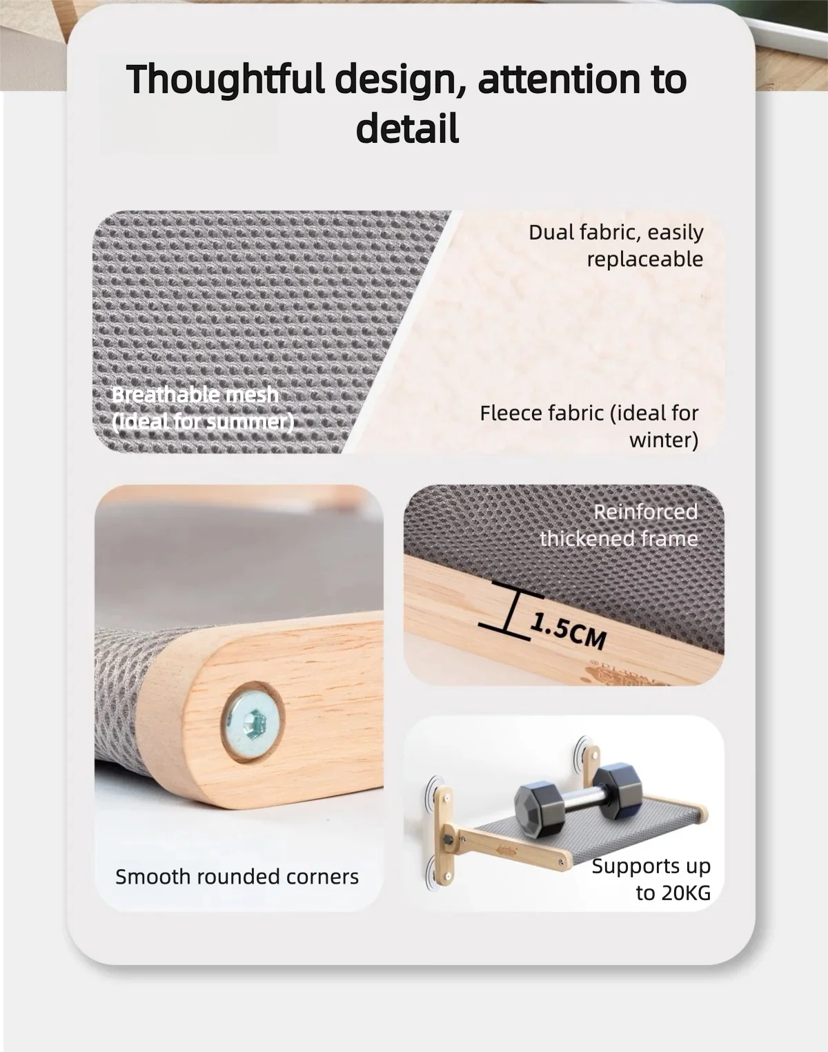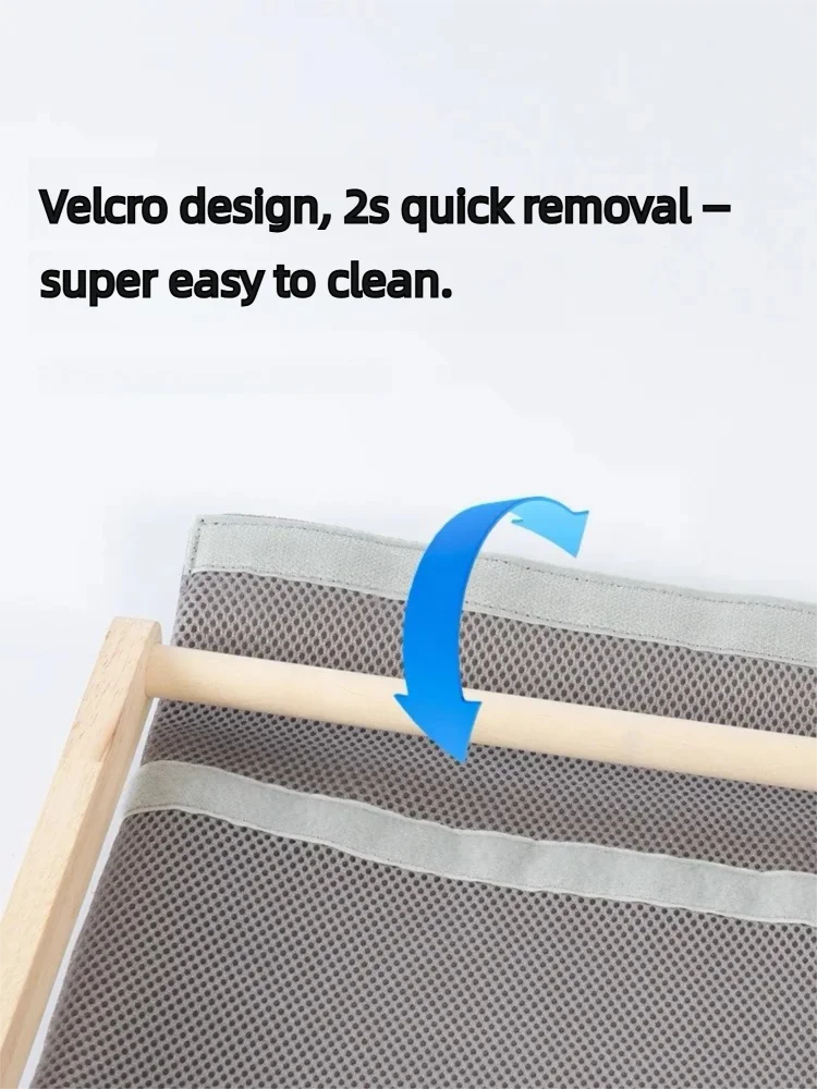 The hammock comes with two interchangeable fabrics: a breathable mesh (sandwich mesh) ideal for summer, and a soft lamb fleece (Sherpa fleece) perfect for winter. This thoughtful design ensures year-round comfort.