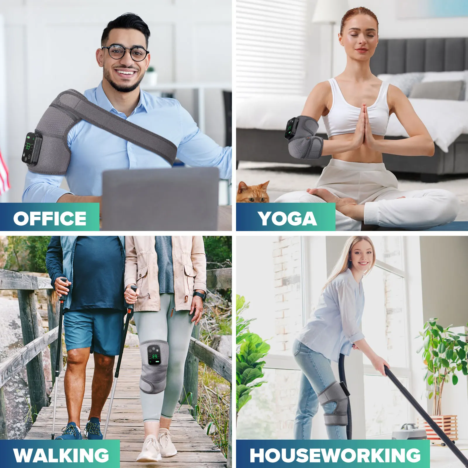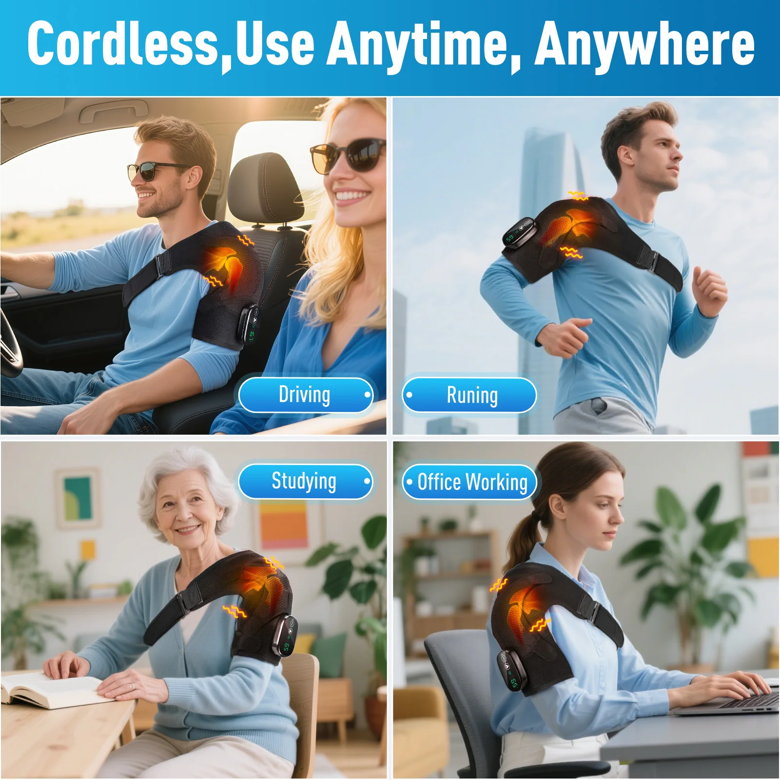 1. Multi-functional heating massage knee pad, shoulder pad + knee pad + elbow pad 3 in 1, suitable for a variety of occasions, such as office, study, driving, sports, walking and so on.